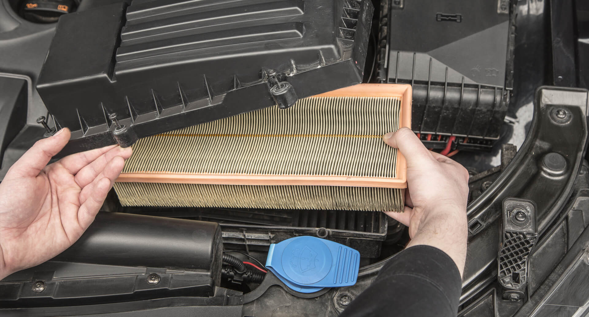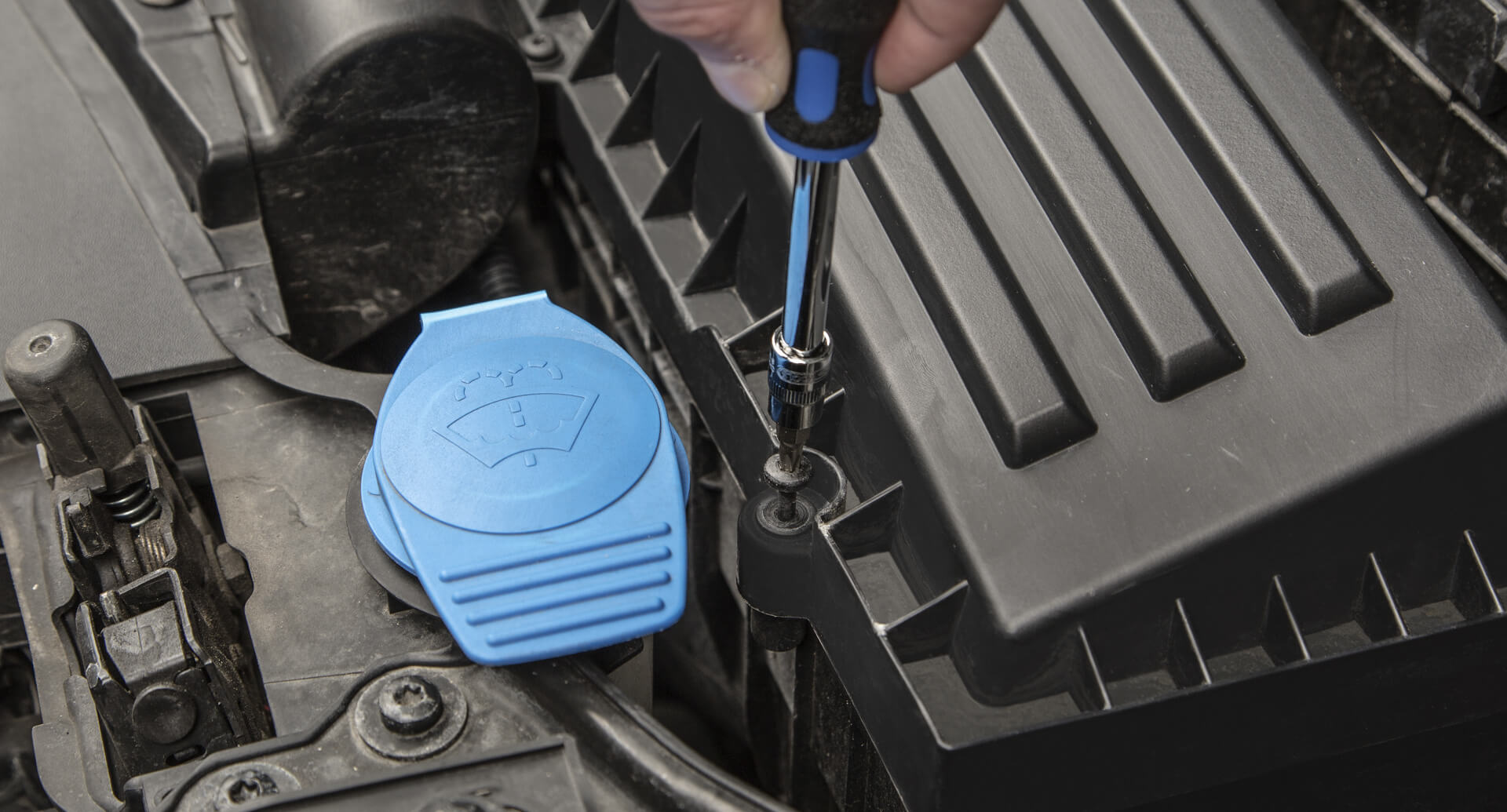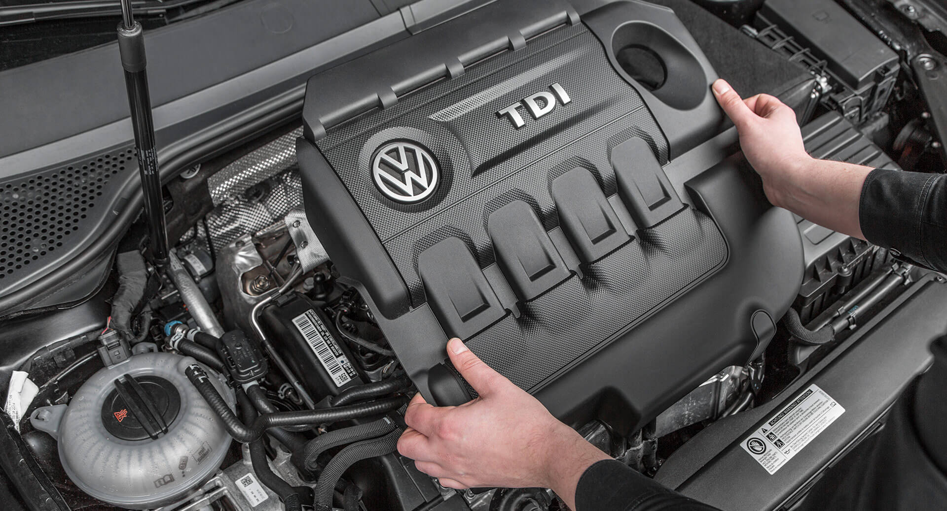 First, open the bonnet and remove the engine cover as shown in the example for the VW Passat (B8) 2.0 TDI with 110kW.