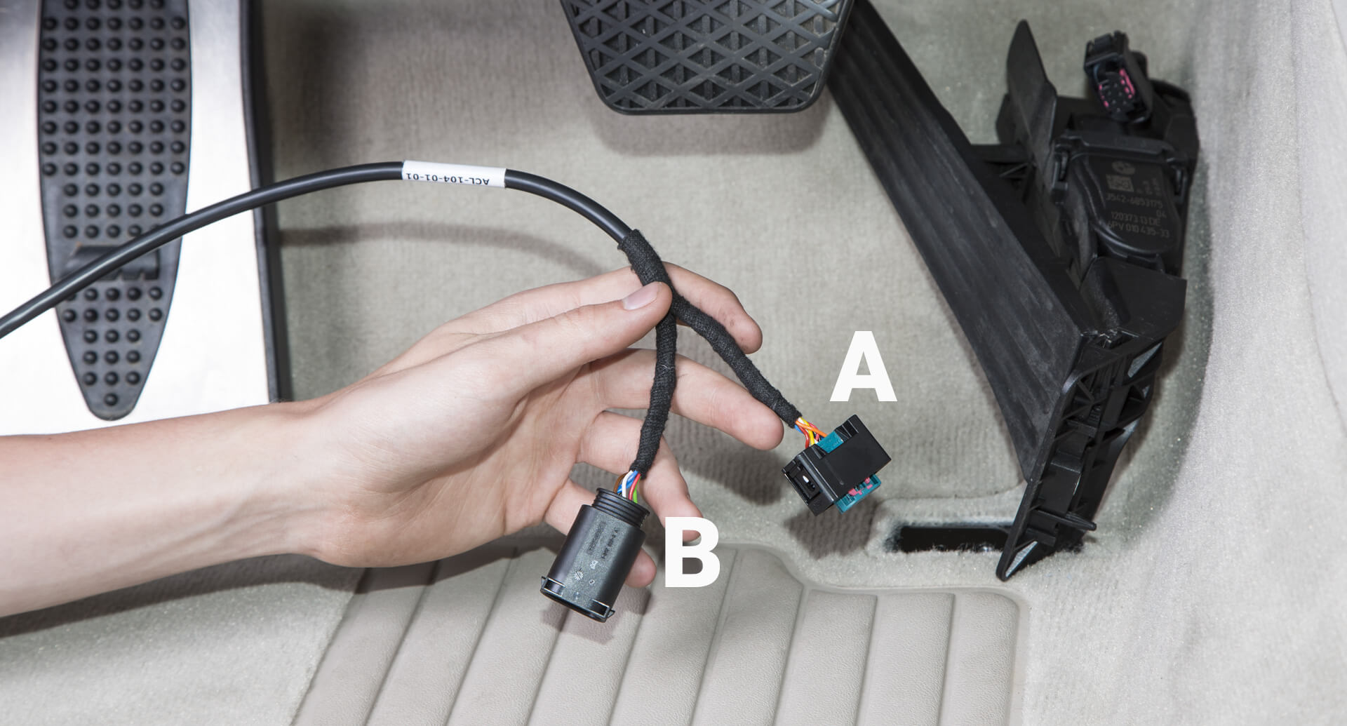 Connect the disconnected plug (B) to the corresponding socket on the RaceChip wiring harness. Ensure that the plugs engage properly.
