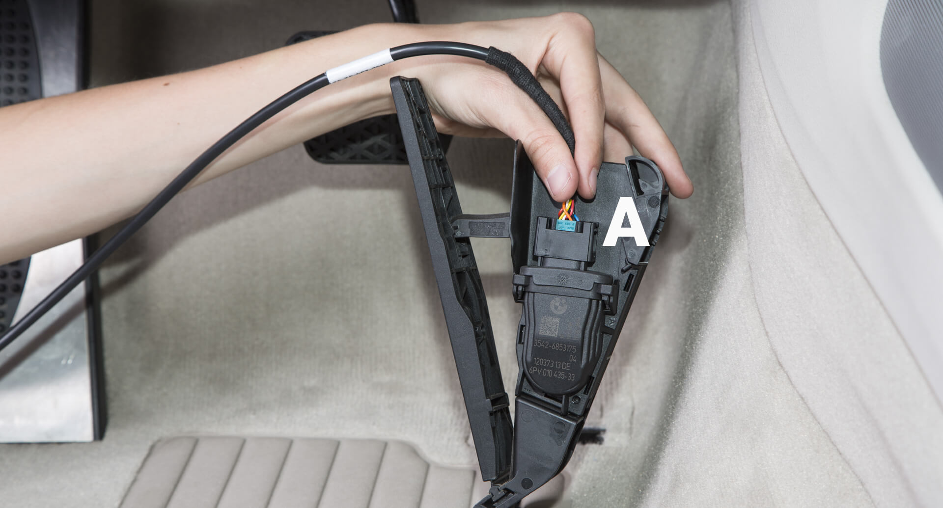 First, the connection to the common rail sensor (A) needs to be made. Pull out the plug by its sensor. Note: only pull on the plug, never the cable.